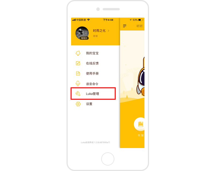打开app,从首页左侧菜单,点击Luka管理